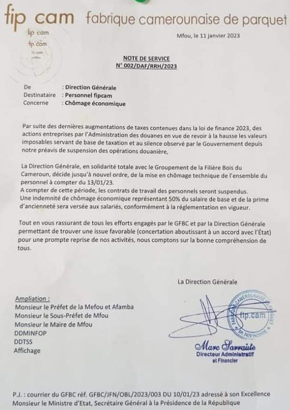 Dans une correspondance adressée au personnel et aux autorités administratives, la société d’exploitation de bois FIPCAM met son personnel en chômage technique en signe de protestation contre la loi de finance 2023 mais oublie l’exploitation illégale de bois commise au Cameroun.